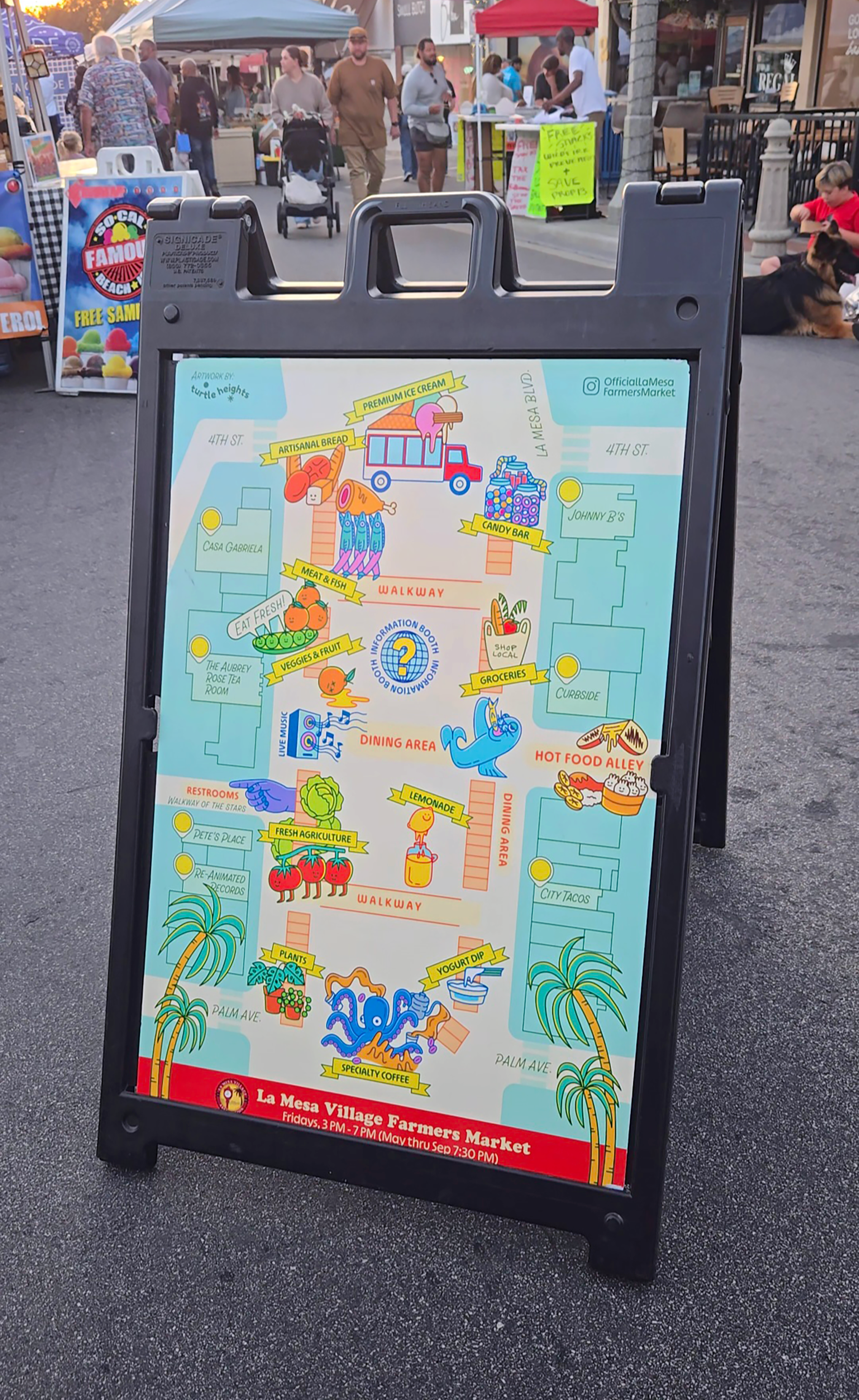 24" × 35" illustrated map created for the La Mesa Farmers Market and La Mesa Village Association. The design highlights key features of the market, surrounding streets, and local businesses. Installed at the market entrance to guide and welcome visitors.